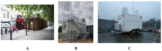 Air quality supersites: Marylebone Road (A), Honor Oak Park (B), mobile measurement station (not in location) (C).