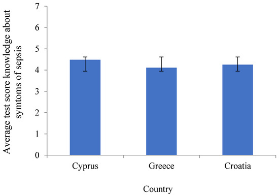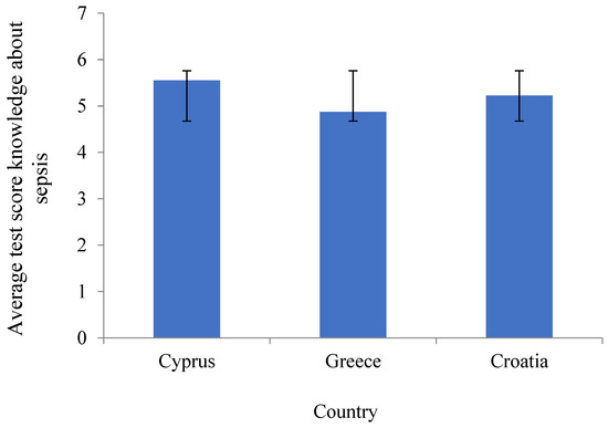 There was a statistically significant difference among the countries (F(2.625) = 4.254, p = 0.015) in the average score in knowledge about sepsis, with Scheffe’s post hoc test indicating that students in Cyprus had a higher average knowledge than those in Greece (p = 0.016), although these two countries are not significantly different from Croatia (both p > 0.05) (Figure 1).