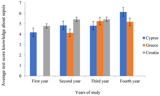 Figure 3 shows the mean scores for the items on the knowledge about sepsis with appropriate error bars for each year and each country. Since there were no data for the first year in Greece or for the fourth year in Croatia, separate one-way ANOVAs were used to test the differences among years of study. In Cyprus, average knowledge is highest among four-year students (F(3.126) = 9.156, p < 0.001), in Greece, higher scores are achieved by third- and fourth-year students compared with second-year students (F(2.78) = 4.475, p < 0.001), and in Croatia, second- and third-year students have higher average score for knowledge compared with first-year students (F(2.418) = 7.385, p < 0.001).