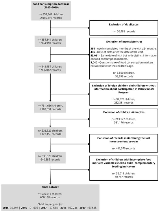 For the analysis, Brazilian children aged 6–23 months with data related to BFP participation and the construction of the complementary feeding indicators were considered eligible. Then, 1,703,631 records from 751,656 Brazilian children with information about the BFP remained, and children under 6 months were excluded (n = 213,127). If repeated measurements were taken from the same child within a given year, only the last measurement of each year was included, resulting in 640,885 observations from 538,529 children. Furthermore, children with missing data on the food markers used to build the indicators (n = 32,018 children, 40,747 records) were excluded. The final sample comprised 506,511 children and 600,138 records (Figure 1).