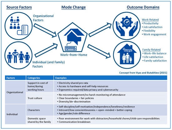 An analytic framework has been established to inform structural considerations for a WFH arrangement and systemic effect on a variety of performance indicators during the pandemic [6]. In this model, “organizational” and “individual and family” factors determine outcomes on “occupation domain” (e.g., productivity, job satisfaction, flexibility, work engagement, and presenteeism/absenteeism) and “family domain” (e.g., work–life balance, life/family satisfaction, personal and family health conditions) (Figure 1).