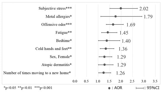 The model included nine variables consistently showing significance among the total 57 variables included in the model: “female sex”, “having atopic dermatitis”, “having metal allergies”, “having cold hands and feet”, “being fatigued”, “moving into a new home one or more times”, “exposure to offensive odors”, “bedtime earlier than 11 p.m.”, and “subjective stress: moderate–frequent”. The results of the Chi-squared test for the model were significant (p < 0.001), with each variable individually showing significance as well (p < 0.05). The Hosmer–Lemeshow test was used to examine the predictive accuracy of the model and showed a high degree of predictive accuracy (p = 0.976); the discriminative predictive value was 91.0%.