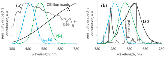 Relative spectral distributions of light sources, including the International Commission on Illumination (CIE) standard visual (photopic, dotted green line, V(λ)) and non-visual (melanopic, dashed blue line, smel(λ)) spectral sensitivities [28]. (a) CIE illuminant A, typifying phased-out incandescent light (dark grey line, CCT = 2856 K, m-DER = 50%), and CIE daylight illuminant D65, representing indirect daylight (light grey line, CCT = 6500 K, m-DER ≡ 100%) [21]. (b) LED lighting in schools 1 and 4 (dark grey line), and fluorescent light in schools 2 and 3 (light grey line); typical examples shown.