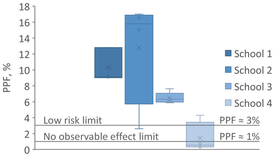 Box and whisker TLM plots (n = 3, 4, 5, and 4 for schools 1–4, respectively) showing the IEEE recommended limits to reduce health problems in viewers due to flicker to a low risk and to there being no observable effects when compared statistically to appropriate (flicker-free) control conditions [25]. The limits at frequencies above 90 Hz have been generalized based on PPF with limit values of 3% and 1% respectively. For the highest PPF value for school 4 only, the signal-to-noise was low; all other PPF values in school 4 were below 1%.