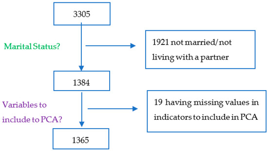 Of the 3305 women aged 15–49 included in the PMA dataset, we retained 1365 married/living with a partner woman in the present analysis (see Figure 1). We employed the data concerning the household level, such as the wealth indicator calculated using asset ownership, household size, and other socio-demographic characteristics, as well as the individual female data, such as measures of education; type of marriage; family planning access, choice, and use; women’s empowerment, etc.