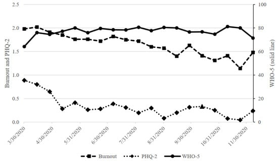 A total of n = 840 tracking tool surveys were completed by 32 SHCs, who each completed between 1 and 120 surveys (mean = 37.3, standard deviation [SD] = 16.1). Mean average burnout score across the nine months of the study was 1.73 (SD = 0.70); mean PHQ-2 score was 0.41 (SD = 0.95); and mean WHO-5 score was 76.2 (SD = 17.0). Biweekly means are presented in Table 1 and Figure 1. Of the 840 entries, 90.0% indicated no symptoms of burnout, with 8.3% of entries indicating one or more symptoms of burnout, 1.3% indicating symptoms of burnout that would not go away, and 0.4% indicating complete burnout. No biweekly mean score met the cutoff for burnout. Of the 840 entries, 97.1% were below the cutoff for depression (<3), and no biweekly mean score met the cutoff for depression.