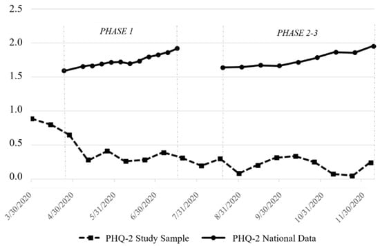 Finally, using descriptive statistics, biweekly mean PHQ-2 scores were compared with national means. We further compared the change in mean PHQ-2 score with the change in national mean score across phases of the HPS.