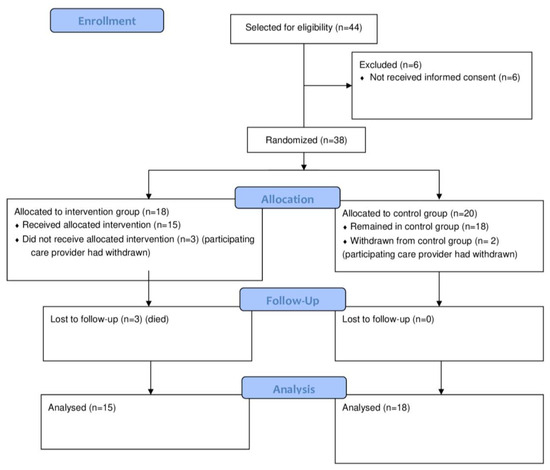 We recruited six care-providing institutions for participation in the study, who subsequently selected 23 participating clusters. From the clusters, the affiliated clinicians selected, in total, 44 eligible participants. For 38 of those 44 eligible participants, informed consent was provided by their legal representatives. Of the 38 participants included in the study, 18 were randomly allocated to the intervention group spread over 11 clusters and 20 to the control group spread over 12 clusters. However, one care provider (with five participants) withdrew from the study before baseline data were collected because of the COVID-19 pandemic. Ultimately, we could analyze the data of 33 participants (15 intervention and 18 control groups) spread over 23 clusters of living facilities in five care providers. Of those 33, three dropped out of the intervention group (two because of fatal illness and one because of a fatal accident; all events were discussed with the DSMB and not related to the intervention), and two stopped the intervention but remained in the study for data collection. See Figure 1 for the flow diagram of participants.