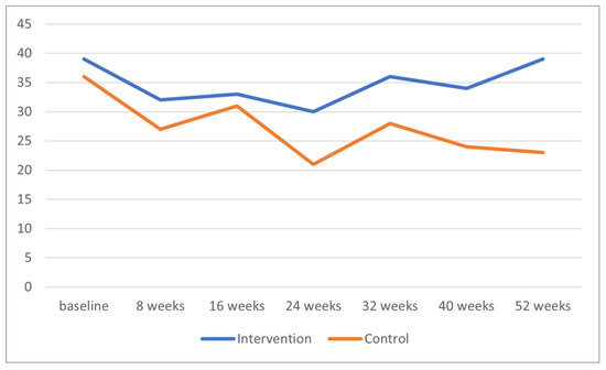 Figure 2 shows the course of the means of the ABC total score for the two groups of participants at baseline, during the intervention period, at the study endpoint (40 weeks), and at follow-up (52 weeks). Paired sample t-tests within the two treatment groups separately showed that the within-group differences between baseline and 40 weeks and between baseline and follow-up were not significant in either group.