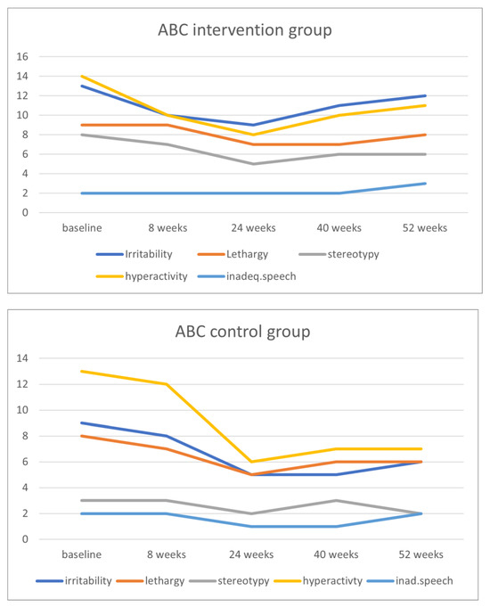 Course of the Aberrant Behavior Checklist (ABC) subscales scores in the intervention and control groups.