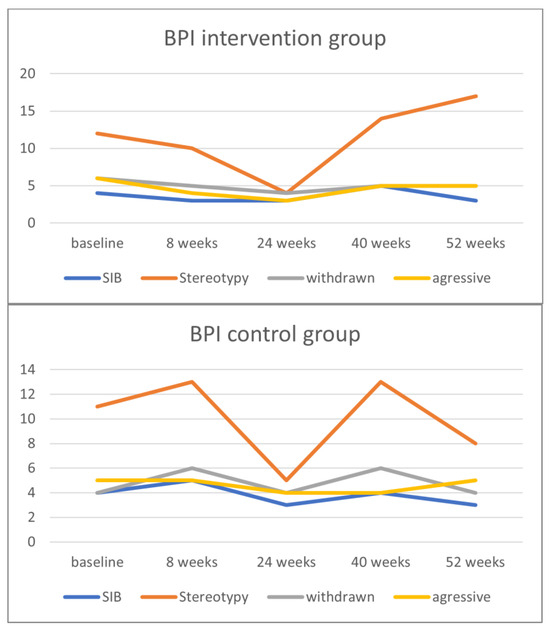Course of the Behavior Problems Inventory-Profound and Multiple Disabilities (BPI-PIMD) subscale scores in the intervention and control groups. SIB = self-injurious behavior.
