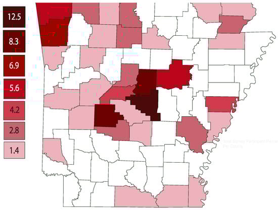 A total of 72 Arkansas small farmers completed the survey between June 2023 and December 2023. The majority of the participants were White (81.0%), female (61.1%), and between the ages of 35 and 54 years old (51.4%). Over 65% of the participants reported having a bachelor’s degree or higher and 66.7% had a household income of USD 75,000 or higher. The majority of the participants reported farming was not their primary job (68.1%), 93.1% selling what they produce and/or raise, and 46.0% of the participants reported farming for five years or less (Table 1). Figure 2 illustrates the counties represented in the survey indicating high participation by small farmers in Central and Northwest Arkansas.