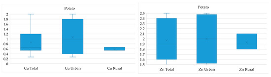 As regards the distribution between urban and rural gardens, the bioaccumulation coefficient varies slightly. For potatoes, the highest correlation with the distribution of heavy metals in the soil is observed. The predominance of copper and lead in urban soils is also present in potato samples from urban areas. The planting location’s effect on the transfer of pollutants from soils to tomatoes is insignificant. Thus, we observe less constant accumulation of pollutants from soils for above-ground vegetables and more for root vegetables. This may be a consequence of the high mobility of these metals naturally occurring in soils, as well as their lower retention in soils compared to other toxic elements [46].