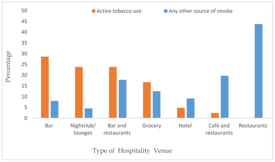 - Singh, A.; Okello, G.; Semple, S.; Dobbie, F.; Kinnunen, T.I.; Lartey, K.F.; Logo, D.D.; Bauld, L.; Ankrah, S.T.; McNeill, A.; et al. Exposure to secondhand smoke in hospitality settings in Ghana: Evidence of changes since implementation of smoke-free legislation. Tob. Induc. Dis. 2020, 18, 44. [Google Scholar] [CrossRef] [PubMed]
