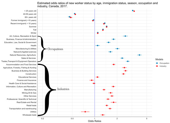 Estimated odds ratios of new worker status by age, immigration status, season, occupation, and industry, Canada LFS, 2017.