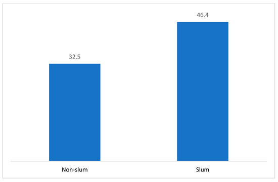 A slum household is defined as one that is situated in a city and lacks at least three of the following amenities: (1) access to a reliable water source (such as a piped connection to the house or plot, a public tap or standpipe, a tube well or borehole, or a protected dug well); (2) access to improved sanitation facilities (such as a flush or pour flush system connected to a piped sewer, a septic tank or pit latrine, or a ventilated improved pit latrine); (3) sufficient living space (with no more than three individuals per room); and (4) housing durability (i.e., the condition of the floors, walls, or roof of the household being natural, basic, or completed). UN-Habitat suggests that enumeration areas should be utilized for identifying slum neighborhoods as they serve as the smallest household clusters in numerous countries and exhibit a considerable degree of homogeneity [19]. The slum families were grouped together at the enumeration area or cluster level to create the slum neighborhood variable that was utilized in this study. According to UN-Habitat [19], a cluster was classified as a slum neighborhood if it contained 50% or more households that were considered slum households.