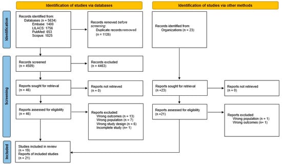 Our search retrieved 5634 studies in the databases MEDLINE (via PubMed), Embase, Scopus, and LILACS. After excluding 1125 duplicates, 4509 titles and abstracts were screened. Full-text articles for the remaining 46 records were retrieved, of which 27 were excluded due to incorrect outcomes, like not describing the prevalence of obesity, an inappropriate population that is not representative of the Brazilian population, incorrect study design, or incomplete studies (Figure 1 and Supplementary Material S3).