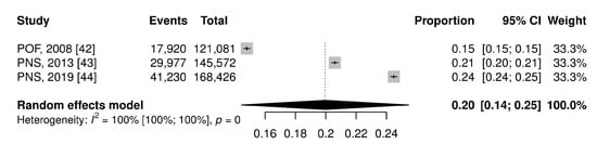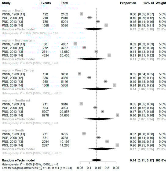 This meta-analysis estimated obesity prevalence using the crude proportions method (PRAW) with random effects []. We chose this method because it corrected the overestimation of the weight of studies with estimates very close to 0% or 100% []. Subgroup analyses were performed by sex, Brazilian cities, regions, and housing location. Heterogeneity was assessed by the random-effects model, the chi-squared test was applied with a significance of p < 0.10, and its magnitude was determined by the I-squared (I2).