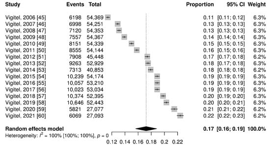In all analyses, a p-value < 0.05 was considered statistically significant. Publication bias analysis was not performed as long as this measure is inappropriate for prevalence meta-analysis []. Analyses were performed in the RStudio software, version 4.1.0 (R: A Language and Environment for Statistical Computing, Vienna, Austria), by using the ‘Meta’ package, version 5.0-0.