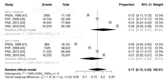 Our estimates were higher than those presented by another study [] carried out with four population-based studies (20.0 vs. 8.6%), a similar result when stratified by gender. However, our findings are close to those presented in the National Health Surveys of 2013 and 2019 [].