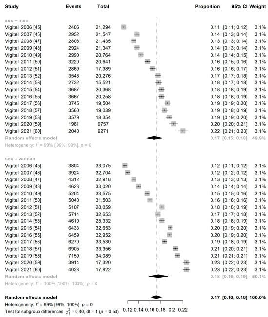 In this study, analyses by subgroup according to gender, geographic region, and place of residence did not show statistically significant differences. However, it is essential to highlight that women residing in Brazil and Brazilian capitals showed a higher prevalence of obesity than men, a trend like that observed in Brazilian population-based surveys and in other countries around the world [,,,,,]. In Brazil, there are differences in the sociodemographic profile between men and women with obesity. A higher prevalence of obesity is observed in men with higher per capita household income and a higher level of education; on the other hand, a higher prevalence of this health problem is found among women with low education and lower income [,].