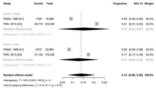 Obesity in the urban area was two percentage points higher than in the rural area, with a prevalence of obesity of 15.1% (95% CI: 3.1%; 27.2%) versus 12.7% (95% CI: 3.6%; 21.8%). However, there was no statistically significant difference between the subgroups (p = 0.75) (Figure 8).