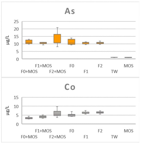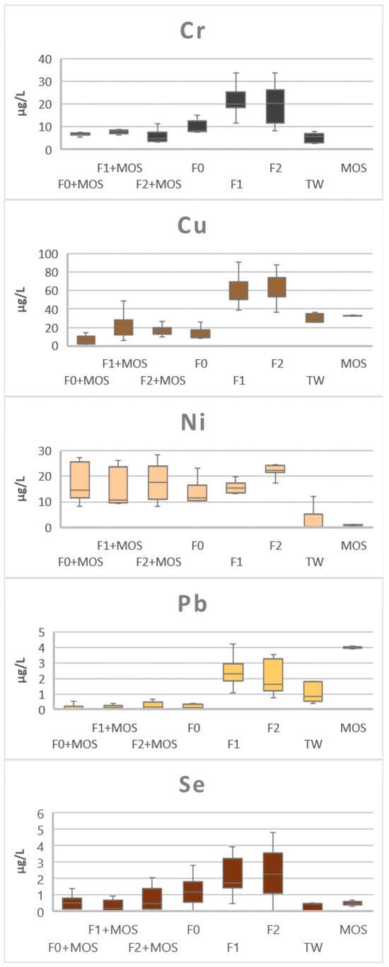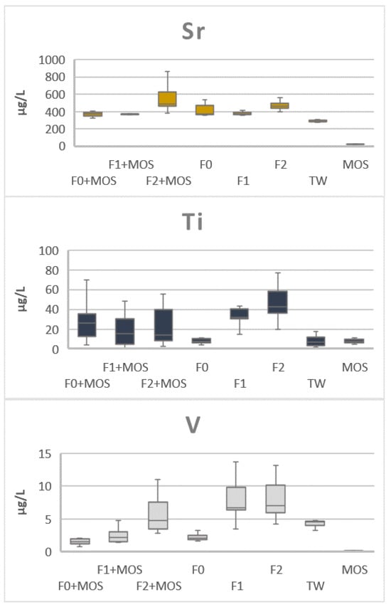| Sample | As [μg/L] | Co [μg/L] | Cr [μg/L] | Cu [μg/L] | Ni [μg/L] | Pb [μg/L] | Se [μg/L] | Sr [μg/L] | Ti [μg/L] | V [μg/L] |