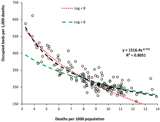 Figure 2, a power law function better describes the actual relationship for occupied beds. Note how the previously used log relationships work well on either side of 8 deaths per 1000 population. The issue of data availability for international beds will be covered in the discussion. Hence, the power law relationship was used to calculate the difference between the actual and the trend line to investigate the role of ASMR in