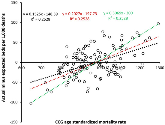 Figure 3 shows the relationship between the difference for the actual minus the expected trend line for total CCG bed demand (acute + mental health + maternity) as beds per 1000 deaths and the all-cause ASMR for each CCG. Three trend lines are shown, all with an R-squared of 0.2528 but with different fixed intercepts. The black dotted line gives the actual trend, the red dotted line shows the relationship when the median value of the raw data is placed into bins at intervals of 100 units of ASMR, and the green dotted line is constrained to the slope describing the upper and lower edges of the data.