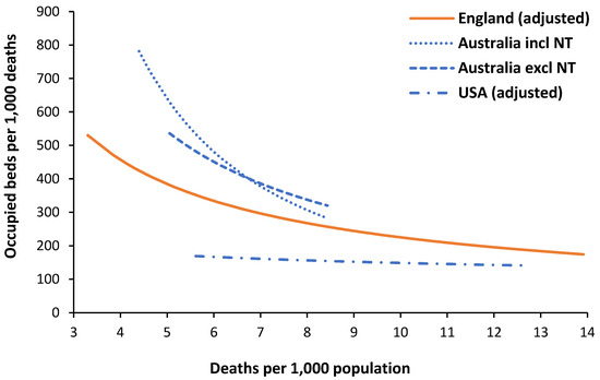 15]. The data from Australia and the USA includes all hospital types, including privately owned. This is omitted from the data for England, where private hospitals only cover elective surgical admissions and around 10% more occupied beds can be assumed. Hence, move the line downward by around 12% for England. English and Australian data include an allowance for bed occupancy due to same-day admissions assuming an 8 h average stay. This is omitted from the US data which can be increased by 15%, assuming the USA has more same-day activity than England [