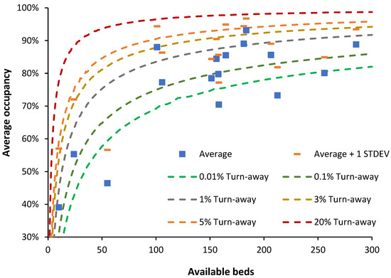 Some years ago, I developed a method to use the Erlang B equation, the simplest form of queuing theory, to show lines of constant turn-away on a graph with available beds as the x-axis and average occupancy on the y-axis; see L.2–L.6, L.12, in [