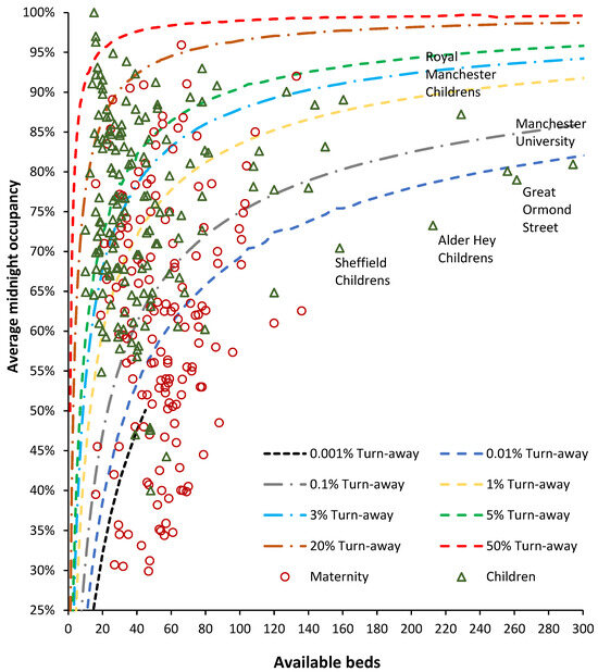 Figure 10 can then form the basis for constructing a system for ideal occupancies based on size. Hence, a realistic starting point in England is no greater than 1% turn-away in maternity, pediatric, and CCU units and no greater than 3% turn-away for the totality of the adult bed pool. Lower levels of turn-away are desirable but may not be achievable given current constraints.