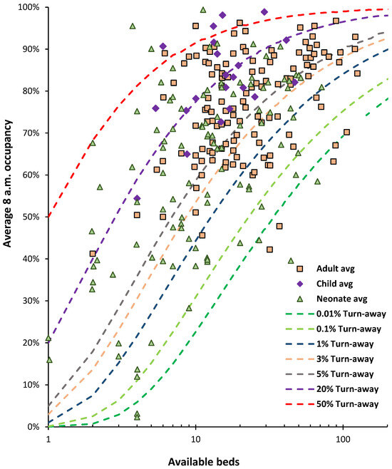 Erlang B contains several assumptions; however, hospitals requiring unhindered access, such as children’s, oncology, etc., generally need to operate near or below the 0.1% turn-away line. Data for 17 single-site specialist hospitals are shown in