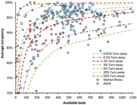 Lines of constant turn-away from the Erlang B queuing model are used to determine if individual hospitals have sufficient available beds to meet the expressed bed demand. For optimum patient flow and efficiency, the average occupancy for a 1000-bed hospital should be around 75% to 80%, see L.12, in [