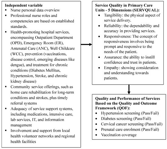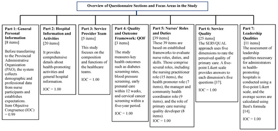 The study used a questionnaire with seven sections with eight items. Part 1 includes general personal information about nurses. Part 2 covers the health-promoting hospital’s general information and activities. Part 3 concerns the service provider team. Part 4 focuses on core indicators (Quality and Outcome Framework: QOF) and primary service outcomes, which includes the percentage of Thai population aged 35–74 screened for diabetes by blood sugar level. We screened a portion of the Thai population aged 35–74 for high blood pressure. The study aims to determine the percentage of pregnant women who receive their first antenatal care within 12 weeks, as well as the percentage of women aged 30–60 screened for cervical cancer within a five-year period. Part 5 is a questionnaire with 39 questions about the roles, duties, and skills of professional nurses in hospitals that promote health. The questions are based on the Canadian Nurses Association’s studies [13] on the roles, duties, skills, and scope of practice of professional nurses, as well as other relevant studies [13]. Part 6 rates the quality of service in primary care units based on how people actually feel and what they expect. It does this by using a questionnaire created by Kittisak Saengthong [15] that uses the five dimensions of SERVQUAL: tangibility, reliability, responsiveness, assurance, and empathy. Each dimension has five questions, and the answers are given on a five-point Likert scale [17]. Part 7 contains 11 items about leadership qualities necessary for administrators in health-promoting hospitals and is scored on a five-point Likert scale, calculating average scores per Best’s formula [14].