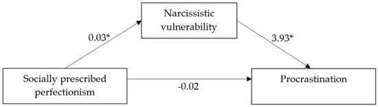 Finally, H4 was confirmed: mediation analyses suggest that socially prescribed perfectionism does not directly affect procrastination, in agreement with what Sherry and colleagues [114] observed, but exerts an indirect effect through narcissistic vulnerability. The influence of narcissistic vulnerability on procrastination, for the first time explored in this study, could be related to the function of procrastination as a defensive strategy to avoid negative emotions [115]. The hypersensitivity to rejection and humiliation and concern about external judgment that individuals characterized by greater narcissistic vulnerability develop from the experience of unbalanced affective relationships with parental figures [78,116,117,118], make them more prone to thoughts about the consequences of failing to be perfect [56,57].