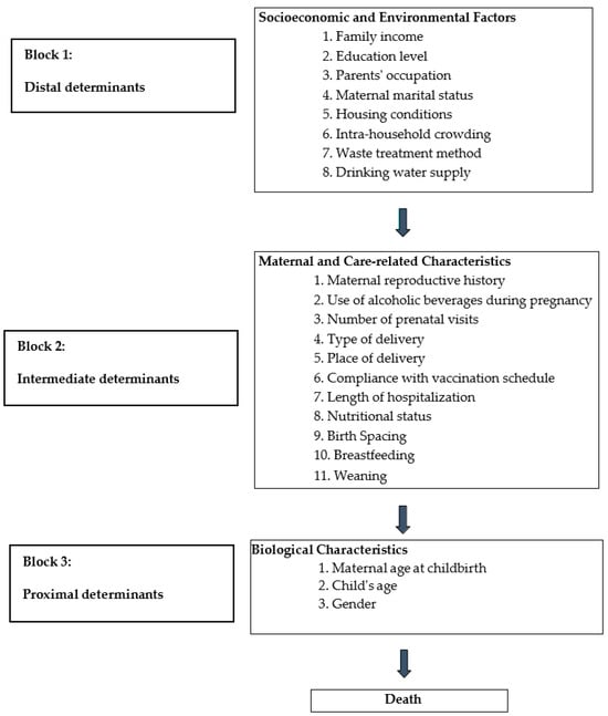 Since many factors under study could confound the associations, the variables were hierarchically organized into blocks for the selection of confounding factors most strongly associated with deaths in children under five years old.