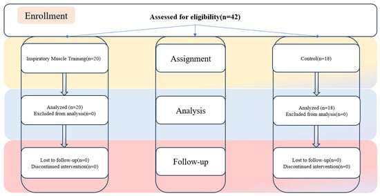 According to the statistical power requirements established in a previous study [23], it is stipulated that a minimum of eight subjects per group is essential. Additionally, the sample size was estimated before the experiment, leading to the recruitment of 42 participants. Prior to randomization, 4 participants withdrew, resulting in a final total of 38 participants. In this study, 38 healthy college students with moderately low scores on a physical fitness assessment were randomly allocated into two groups: an inspiratory muscle training (IMT) group comprising 20 participants and a control group comprising 18 participants. Participants were assigned to the experimental or control group based on their assigned numbers using a random number generator or software. Participants were assigned numbers prior to being allocated to either the experimental or control group through the application of a random number generator or software. The inclusion criteria comprised the following: (1) non-smoking status, (2) aged over 18 years, (3) absence of respiratory or pulmonary pathologies, (4) lack of formal exercise training background and consistent exercise routines, and (5) no usage of supplements or medications that could potentially influence the study outcomes. The experimental procedure received approval from the University Institutional Ethics Committee, and prior to the study’s commencement, participants provided informed consent after receiving comprehensive information about the training procedures and potential associated risks. The procedural flow is delineated in Figure 1.