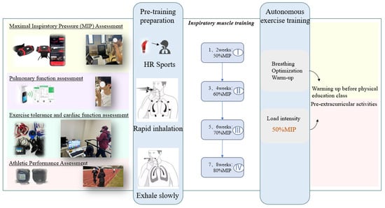 The experimental design included a standardized instructional training session before the warm-up exercise at the beginning of each exercise session. The focus was on adjusting the warm-up training load to prevent disruption to the exercise routine. The IMT group followed two warm-up protocols: one integrated into the daily physical education class routine, which included a respiratory warm-up before the standard warm-up and another before extracurricular activities. These warm-ups involved inspiratory muscle training techniques with 50% MIP and 30 repetitions per set. Before participating, all participants had to complete a standard instructional training session involving 2 sets of training volume per day. Details of the process are provided in Figure 2.
