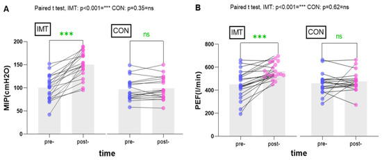 Effects of inspiratory muscle training (IMT) on (A) maximal inspiratory pressure(MIP) and (B) peak expiratory flow(PEF).
