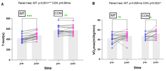 After 8 weeks of teaching and training, the data in Table 3 were analyzed. The students in the IMT group showed significant improvements in all indicators except for VO2max, METS, VE, and BR related to exercise tolerance and cardiac function, which did not exhibit significant changes. MIP values increased significantly from pre- to post-intervention (p < 0.001), with effect size (ES) values appearing larger in the IMT group and smaller in the control group. However, the effect size (ES) values for FVC, FEV1, and FEV1/FVC were moderate in the IMT group and small in the control group. The IMT group demonstrated a significant increase in pulmonary function, while no significant changes were noted in the control group (Figure 3). These results suggest a notable enhancement in the exercise capacity of the students. Conversely, the control group, who received standard teaching, did not show significant differences for most indicators, with the exceptions being VO2max, METS, RQ, and VO2/HR (p < 0.05) pertaining to exercise tolerance and cardiac function. ES values were similar in both groups but larger in the IMT group. Due to factors such as variations in body types that could have influenced the VO2max results, there were discrepancies between the observed VO2max results in the IMT group and the control group when compared to the initial predictions. Interestingly, a notable change in VO2max was noted in the control group, while the IMT group did not exhibit significant alterations as anticipated. Participants in the IMT training group experienced additional benefits, including a significant improvement in t-test values (Figure 4). In the selected 1000 m tests, the IMT group demonstrated a significant change (p < 0.001; ES = 0.633), while no significant differences were found in the control group from pre-intervention to post-intervention (p > 0.05; ES = 0.111).