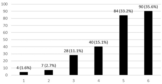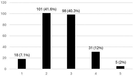 Figure 1 presents data about the perception of the need for a national plan on AMR. A total of 174 pediatricians (71.6%) identified a strong necessity for this, indicated by ratings of five and six points on the Likert scale. Only 11 responders (4.5%) considered it unnecessary to address this issue.