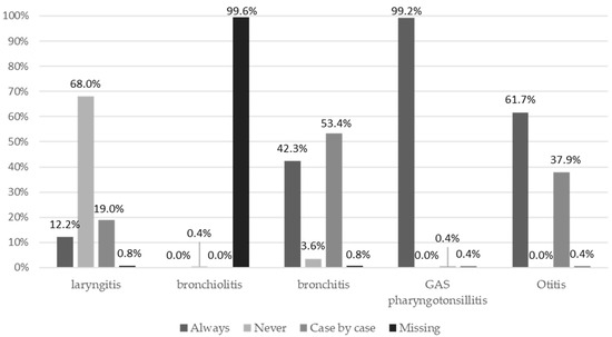 Figure 3 shows the responses to the five clinical cases investigated. In the case of group A streptococcal (GAS) pharyngotonsillitis, 98.8% of the respondents indicated treatment with antibiotics, while, for bronchitis and laryngitis, antibiotic prescription was considered as the first intervention in 42.3% and 12.2% of cases, respectively. More than 60% indicated antibiotic therapy as the first treatment for acute otitis media, whereas 37.9% indicated the need to assess the patient’s characteristics before embarking on antibiotic therapy.