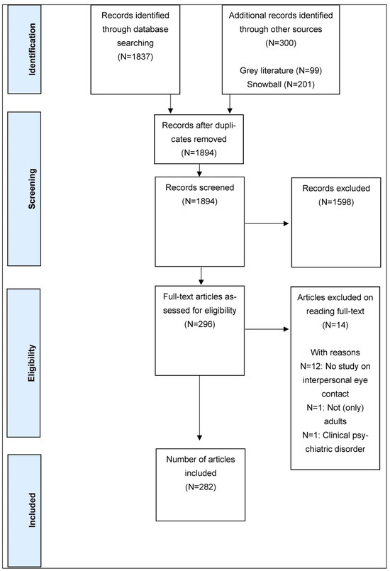 The databank, grey literature and snowball searches, supplemented with the consultation of a research expert in the field of social categorizations, yielded a total of 2137 potential records for research sub-question 1 (see Figure 1 for PRISMA flowchart). After duplicates were removed, 1894 records were independently screened for eligibility, based on title and abstract. After exclusion, 296 records were assessed further. Finally, 282 records were included: 105 articles (with 118 sub-studies) focusing on presentations of eye contact and 177 articles (with 232 sub-studies) focusing on interpretations of eye contact. During this process, multiple consensus meetings occurred whereby Cohen’s Kappa values for inter-rater reliability [63] ranged between 0.65 (moderate) and 0.94 (almost perfect).