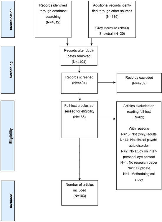 The databank, grey literature and snowball searches yielded a total of 4931 potential articles for research sub-question 2 (see Figure 2 for PRISMA flowchart). After duplicates were removed, 4404 articles were independently screened by two reviewers for title and abstract. After exclusion, 165 articles were assessed for eligibility. Finally, 103 articles were included in this research: 42 articles (with 42 sub-studies) focusing on presentations of eye contact and 62 articles (with 63 sub-studies) focusing on interpretations of eye contact. During this process, multiple consensus meetings occurred whereby Cohen’s Kappa values for inter-rater reliability [63] ranged between 0.66 (moderate) and 0.90 (strong).