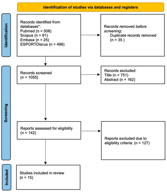 Disagreements between reviewers were resolved by consensus and, when necessary, through a third reviewer (MPT). In this scene, fourteen of the fifteen included studies were in consensus between the two researchers, achieving an agreement of 93%. A total of 8 papers, of the 142 screened, were selected as in doubt by the two reviewers (6 by VMF and 2 by EB). From these eight, after consulting the third reviewer, one of them was included because it met the inclusion criteria. Article language was restricted to English, Portuguese, and Spanish. Results were exported to a single file in the EndNote software.