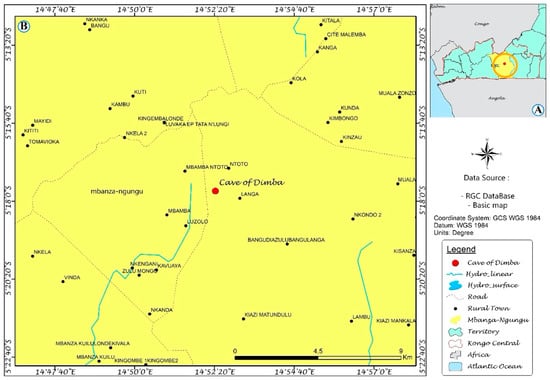 (A) Mbanza-Ngungu territory located in Kongo central province of the DR Congo, (B) location of the Dimba Cave (red dot).