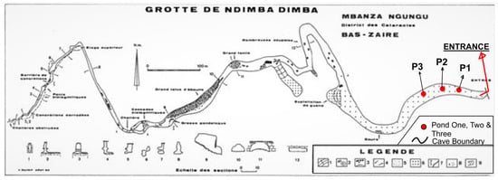Dimba Cave was discovered in the beginning of the 20th century, around 1920, and it was found to contain vast archeological artifacts of considerable interest to the investigation of pre-historic times of the region [,]. This cave is located in the territory of Mbanza-Ngungu, in the central part of the Democratic Republic of the Congo (DRC). Currently, the cave has high touristic frequency and because of the archaeological vestiges found therein, it has potential for being inscribed in the UNESCO World Heritage List. Therefore, the investigation and preservation of this unique Dimba Cave should be a priority.