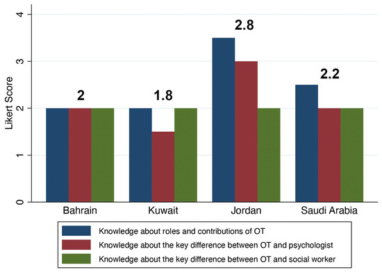 - Tariah, H.S.A.; Abulfeilat, K.; Khawaldeh, A. Health Professionals’ Knowledge of Occupational Therapy in Jordan. Occup. Ther. Health Care 2012, 26, 74–87. [Google Scholar] [CrossRef] [PubMed]