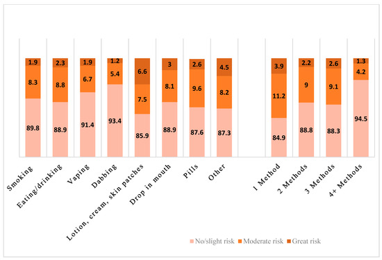 We used Stata/MP 18’s svy function (College Station, TX, USA) and subpop command in all analyses to account for the NSDUH’s multi-stage, stratified sampling estimates to ensure that variance estimates incorporated the full sampling design. All estimates presented in this study are weighted, except sample sizes. First, we presented sociodemographic and health characteristics, other substance use, and the perceived risk of smoking cannabis 2–3 times a week among past-year cannabis users. Second, we presented cannabis use characteristics, including the proportion of those who reported any medical use, cannabis use frequency, CUD severity, and consumption methods. Third, we used multinomial logistic regression analyses to test H1 (association between the number of cannabis consumption methods and cannabis risk perception). We used three categories for the number of methods as the dependent variable: a single (1) method (reference category), 2–3 methods, and 4+ methods. Covariates were the sociodemographic and health status variables, other substance use, and CUD. Due to the multicollinearity between cannabis use frequency and CUD based on variance inflation factor values (using a cut-off of 2.50 [48]), we only entered CUD in the model. Fourth, we fitted four binary logistic regression models to test H2 (associations between different modes of cannabis consumption and cannabis risk perception), with smoking only, edibles or drinks only, any vaping, and any dabbing as the dependent variables. “Any vaping” and “any dabbing” were chosen, as only small proportions of past-year cannabis users had only vaping or any dabbing. We excluded 107 past-year users who did not provide valid data on their risk perception from the multivariable analyses. Multinomial and binary logistic regression model results are presented as relative risk ratios (RRRs) and adjusted odds ratios (aOR), respectively, with 95% confidence intervals (CI). Significance was set at p < 0.05.